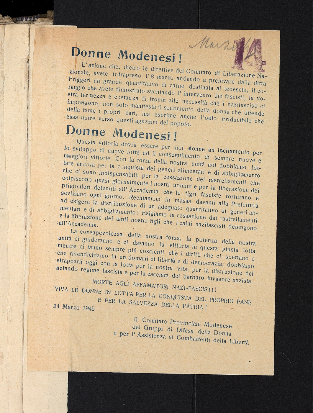 Il volantino, a stampa, si rivolge alle donne modenesi raccontando l'azione di prelevamento svolta al salumificio Frigieri di Paganine l'8 marzo 1945. Con questa azione, svolta su direttive del Comitato di liberazione nazionale, è stato prelevata carne destinata ai tedeschi mostrando non solo "il manifesto della donna che difende dalla fame i propri cari", ma esprimendo anche l'odio verso "questi aguzzini del popolo". Tale vittoria dovrà essere di incitamento per nuove lotte e vittorie: unite si avrà la forza di ottenere cibo e vestiario, per far cessare i rastrellamenti e ottenere la liberazione dei prigionieri detenuti all'Accademia di Modena. Le donne sono quindi invitate a manifestare davanti alla Prefettura. La consapevolezza della forza e la potenza della loro unità le guideranno e daranno loro la vittoria "in questa giusta lotta". Forza e unità rendono inoltre le donne sempre più consapevoli dei diritti che spettano loro e che rivendicheranno in futuro, nel contesto dell'Italia liberata. Tali diritti vanno però strappati oggi con la lotta per la vita e per la distruzione e la cacciata del nemico. Il volantino si conclude con la frase: "Viva le donne in lotta per la conquista del proprio pane e per la salvezza della patria!" e riporta la data del 14 marzo 1945. È firmato "Il Comitato Provinciale Modenese dei Gruppi di Difesa della Donna e per l'Assistenza ai Combattenti della Libertà". Scritta a mano, riporta la data del marzo 1945.