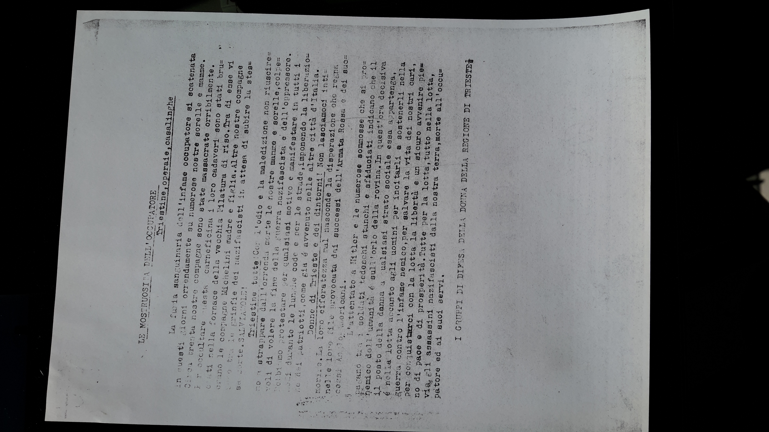 Il volantino, senza data, dal formato A5, munito di un titolo in lettere maiuscole e sottolineato “LE MOSTRUOSITÀ DELL'OCCUPATORE” e di un sottotitolo in lettere minuscole e sottolineato con un solo tratto, “Triestine, operarie, casalinghe”, riporta in fondo al testo la firma in lettere maiuscole, “I GRUPPI DI DIFESA DELLA DONNA DELLA REGIONE DI TRIESTE”.