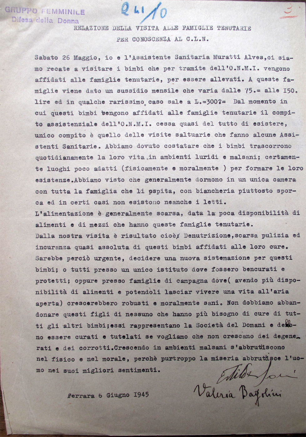 Il documento, dattiloscritto, è una relazione del Gruppo femminile difesa della donna di Ferrara, "per conoscenza al C.L.N." e relativa alla visita fatta il 26 maggio da chi scrive e dall'Assistente sanitaria Alves Muratti ai bimbi che, tramite l'Onmi, vengono dati in affidamento alle famiglie tenutarie. Alle famiglie viene dato un sussidio mensile e, dopo l'affido, l'Onmi cessa quasi del tutto il proprio compito assistenziale fatta eccezione per qualche visita saltuaria. La visita ha constatato come le condizioni di vita dei bimbi non siano "fisicamente e moralmente" sane e adeguate. Nella relazione si scrive che sarebbe quindi urgente trovare una nuova sistemazione per i bambini: o presso un unico istituto o presso famiglie di campagna. Le ultime righe contengono un ammonimento: "Non dobbiamo abbandonare questi figli di nessuno che hanno più bisogno di cure di tutte gli altri bimbi; essi rappresentano la società di Domani  e devono essere curati e tutelati se vogliamo che non crescano dei degenerati e dei corrotti. Crescendo in ambienti malsani s'abbruttiscono nel fisico e nel morale, perché purtroppo la miseria abbruttisce l'uomo nei suoi migliori sentimenti."