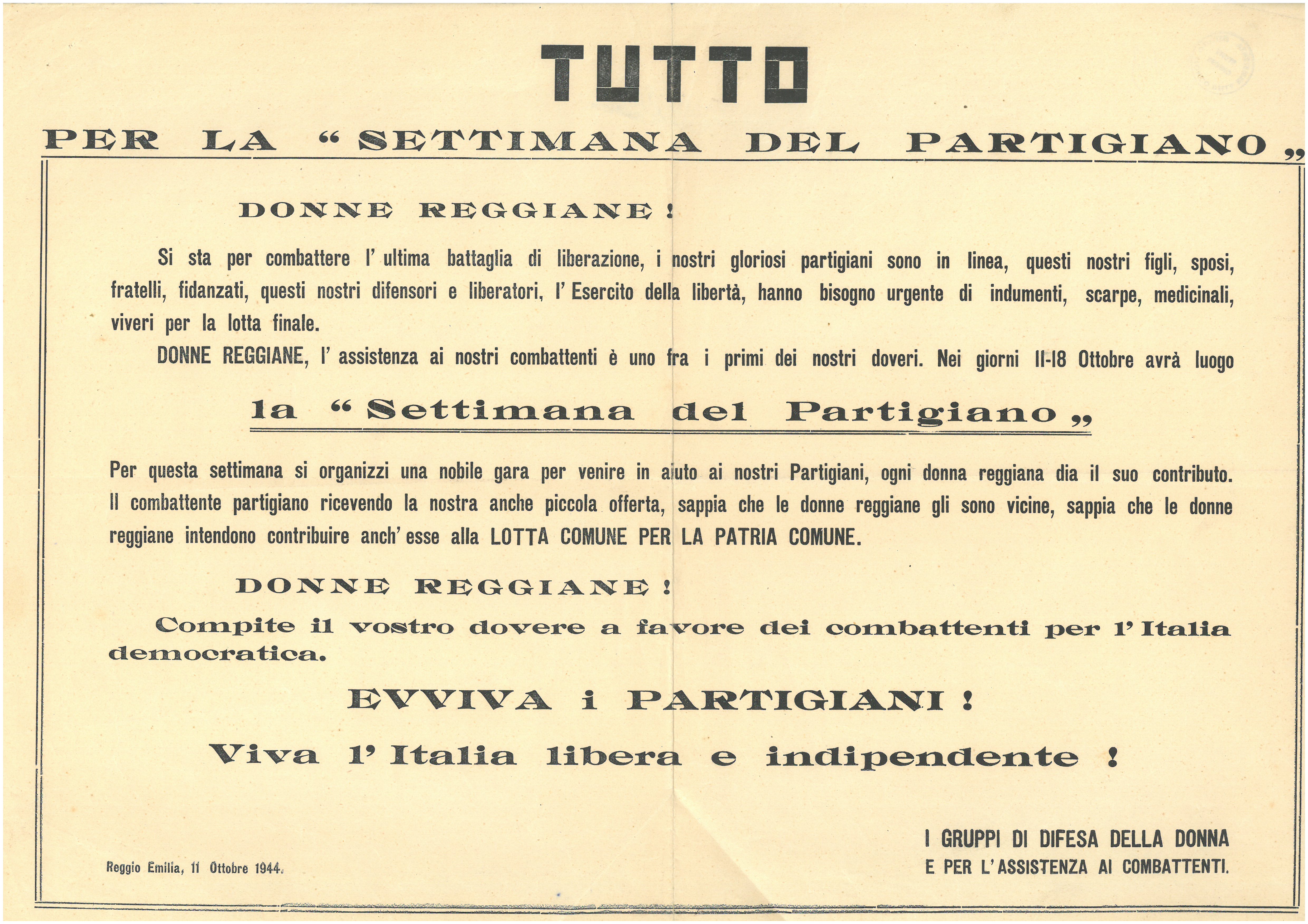 Trattasi di un manifesto prodotto dai Gruppi di difesa dove tutte le donne sono chiamate ad attivarsi per dare il loro contributo ai partigiani che resteranno in montagna. L’esercito della Libertà rappresentato dai figli, sposi, fratelli, fidanzati, che sta per combattere la lotta finale, ha bisogno di viveri, indumenti, medicinali. Le donne reggiane dall' 11 al 18 ottobre si dovranno attivare per organizzare una nobile gara che sia di aiuto ai partigiani. Il combattente partigiano, ricevendo anche una piccola offerta deve sapere che le donne gli sono vicine e le reggiane intendono contribuire anch'esse alla lotta comune.