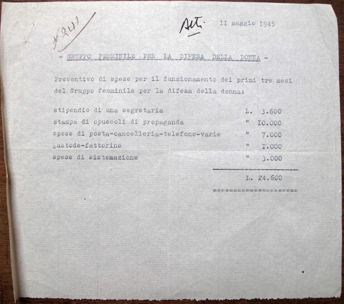 Il documento, dattiloscritto, riporta nell'intestazione la data "11 maggio 1945" e l'autore "Gruppo femminile per la difesa della donna". La prima riga di testo ne enuncia l'oggetto: "Preventivo di spese per il funzionamento dei primi tre mesi del Gruppo femminile per la difesa della donna". Segue l'elenco delle varie voci di spesa con il relativo importo: stipendio di una segretaria, stampa di opuscoli di propaganda, spese di posta-telefono-cancelleria-varie, custode-fattorino, spese di sistemazione. La somma totale è di £ 24.600.